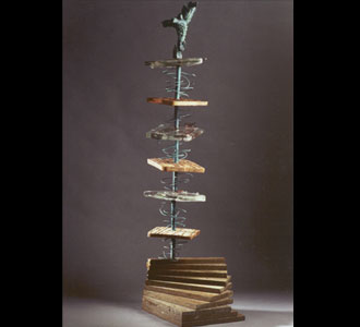 Leading the viewer up a spiral staircase of bronze, aluminum and glass, “Reaching Through” creates a precarious upward motion. With its architectural base and whimsical tower, Rider’s work walks a line between potential and kinetic energy. “Reaching Through” has...