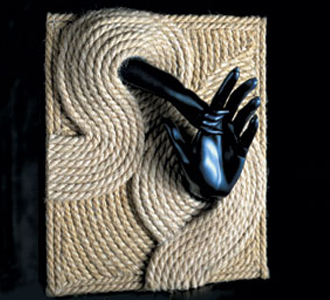 Two jet black hands lead each other through a swirling mass of rope in J. Mac's "Guidance." Its provocative, slinking forms crafted from found and unusual objects, Mac lures the viewer with an enticing game of follow the invisible leader. |