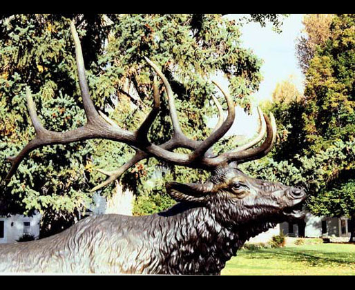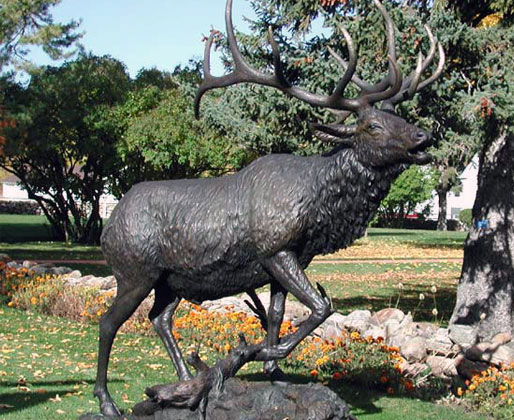 Mike Flanagan’s love for the American West is embodied in this life-size sculpture of the Rocky Mountain Elk. Standing proudly atop a rocky base, the elk seems to be waiting for action, regally displaying his sturdy horns. Highly rendered in bronze, the strong artisanship of Flangan’s work reflects the power and beauty of the frontier.