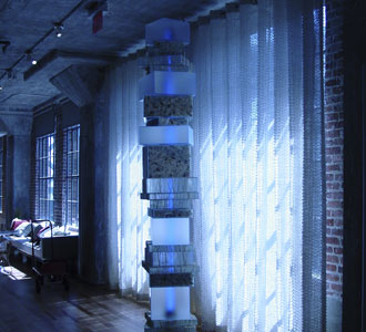 One might approach Huether’s sculpture “It’s Inside” with the anticipation of a child standing before a stack of birthday gifts. The tower of boxes surround a tube of florescent blue light, which gives the piece an eerie glow and allows the viewer to see through select boxes into the middle of the work. Each box is a different shape, color or texture, inviting the viewer to explore each individual shape with anticipation. Huether’s work creates an exciting tension between interior and exterior, form and meaning, solidity and transparency. |
